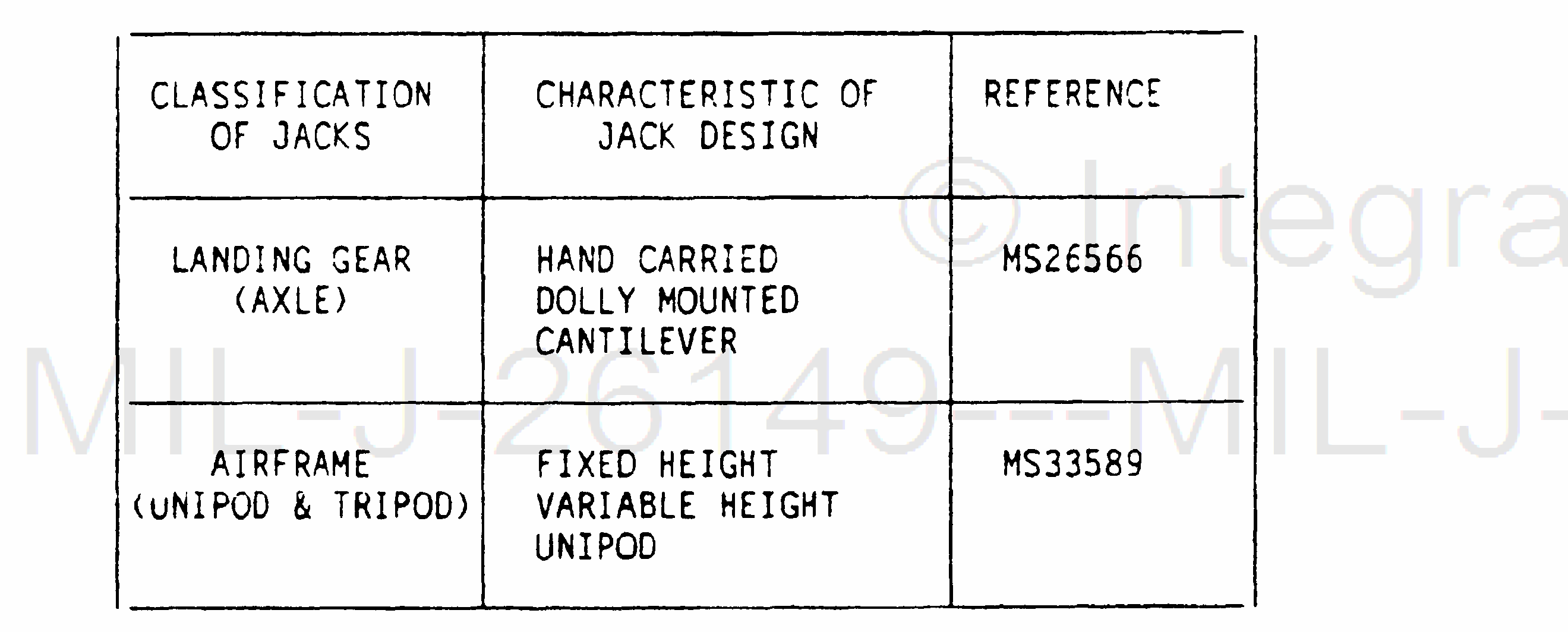 1.2 Classification. All aircraft jacks shall be classified as to their design or use. These classifications shall be in accordance with Table 1.